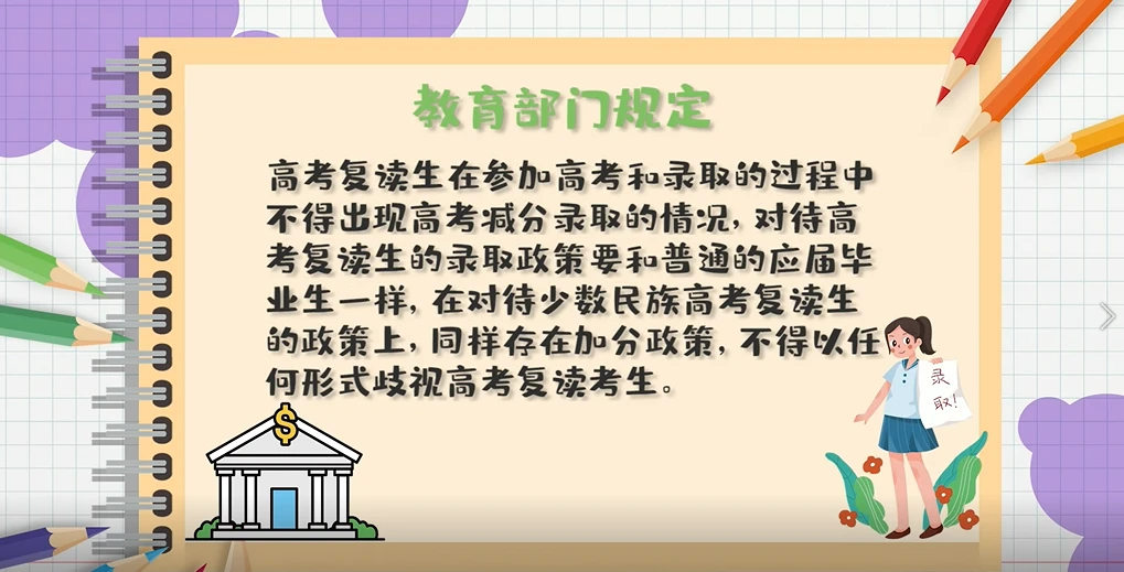 各省市的教育考试部门明确规定,高考复读生在参加高考和录取的过程中不得出现高考减分录取的情况,对待高考复读生的录取政策要和普通的应届毕业生一样,在对待少数民族高考复读生的政策上,同样存在加分政策,不得以任何形式歧视高考复读考生。
