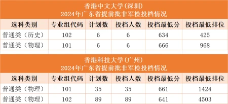 第二类:有2所学校是在“提前批-非军检”招生,如:香港中文大学(深圳)、香港科技大学(广州)。
