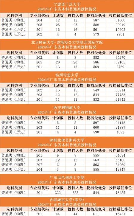 最后,我们通过2024年广东省投档分数线,来看看这些高校多少分能上: