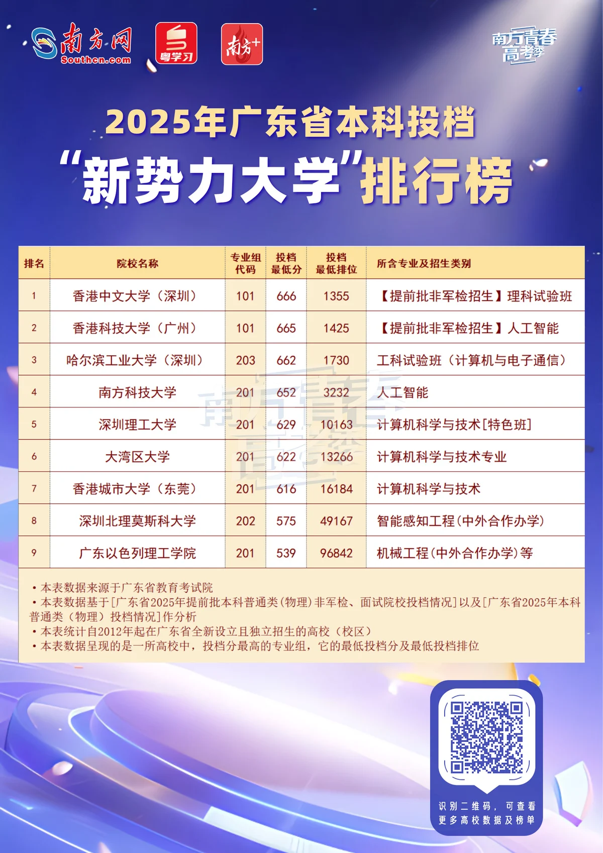 其中,香港中文大学(深圳)、香港科技大学(广州)在提前批非军检批次招生,受高分考生欢迎。