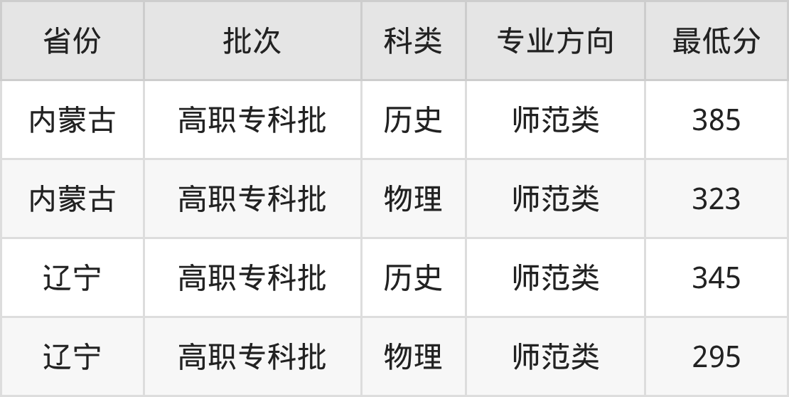 辽阳职业技术学院音乐教育专业录取分数线从295分到385分不等,最低分数线如下: