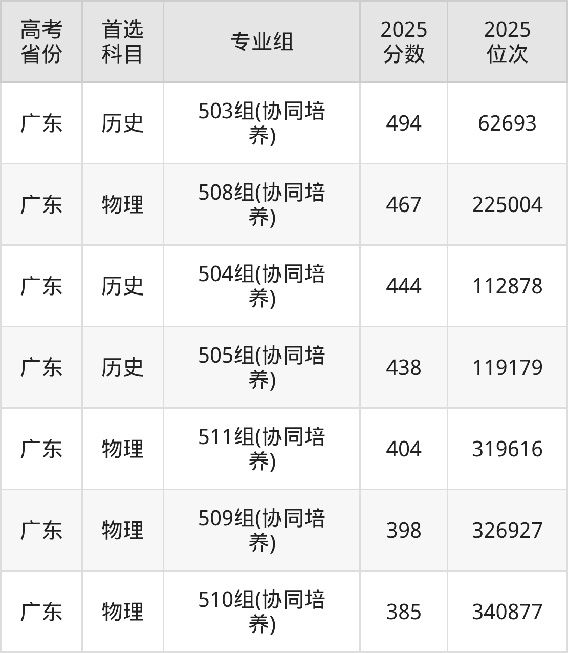 下方图片展示的是广东省外语艺术职业学院协同培养2025年录取分数线汇总: