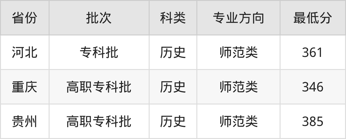 新疆师范高等专科学校早期教育专业在全国各省最低录取分数线为346分(重庆历史类),除此之外,在其余地区的最低分为贵州历史类385分、河北历史类361分,以上数据均为2025年数据,供2026年高考生参考。