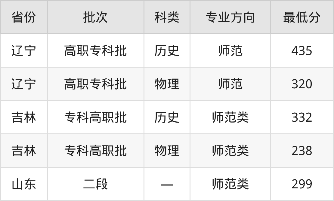 长春师范高等专科学校早期教育专业录取分数线从238分到435分不等,最低分数线如下: