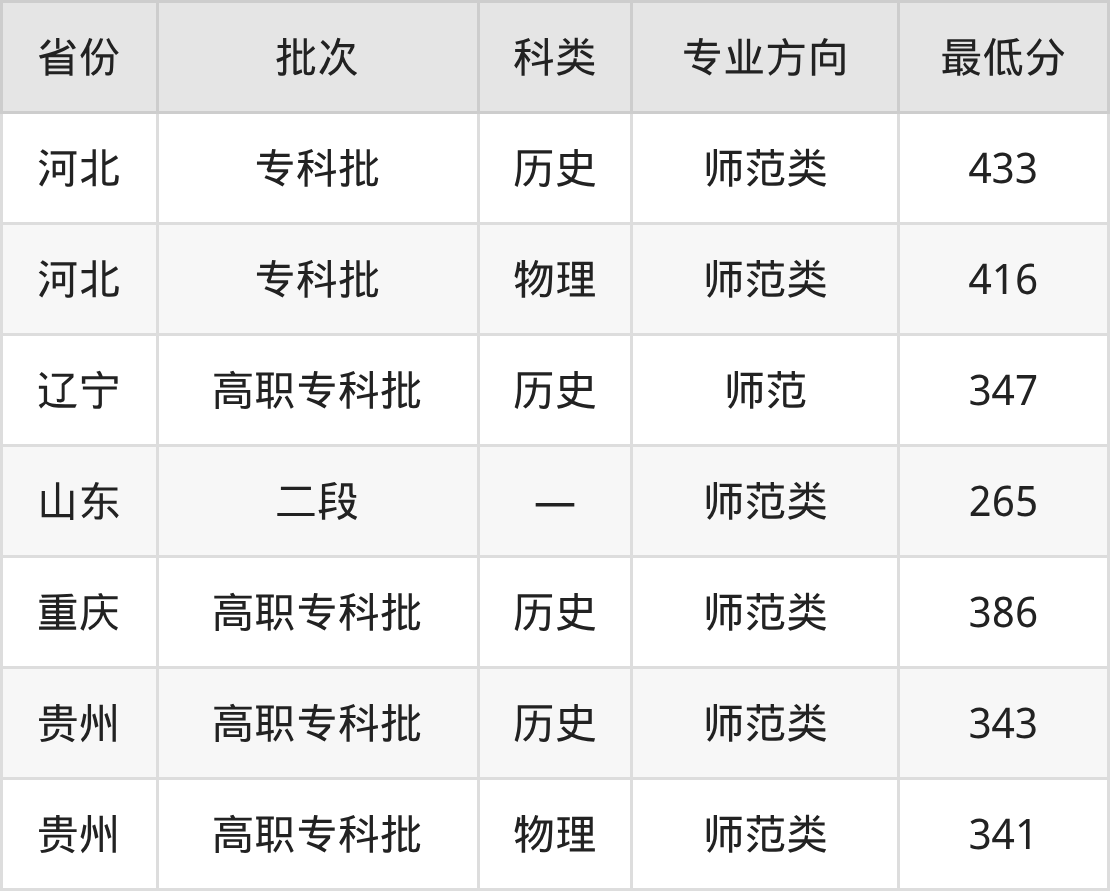 周口职业技术学院小学教育专业在全国各省最低录取分数线为265分(山东),除此之外,在其余地区的最低分为河北物理类416分、辽宁历史类347分、重庆历史类386分、贵州物理类341分,以上数据均为2025年数据,供2026年高考生参考。