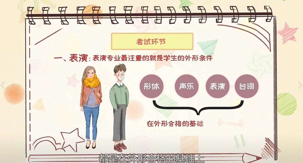 表演专业最注重的就是学生的外形条件,其他类似形体、声乐、表演、台词,都是在外形合格的基础上,才会考虑优劣,占的分数比例不大。