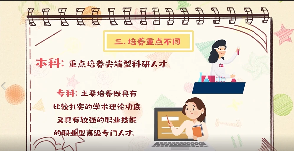 3. 培养重点不同:本科重点培养社会需要的尖端型科研人才,其发展主要在于学术质量的提高而不是规模的扩张;专科主要培养既具有比较扎实的学术理论功底,又具有较强的职业技能的职业型高级专门人才。