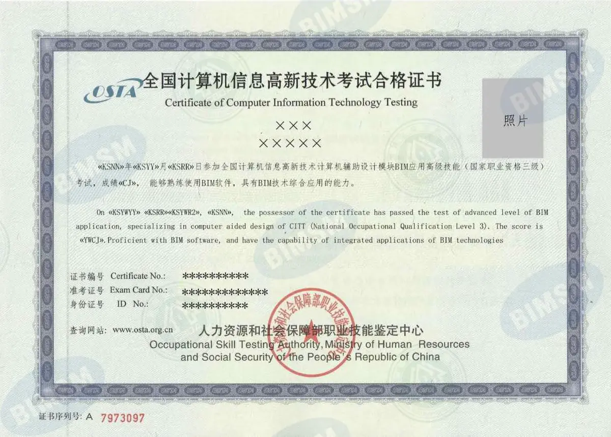 bim证书:全国BIM技能等级考试证书是由中国图学学会颁发,一级证书为BIM建模师(不分专业);二级证书为BIM高级建模师(区分专业);三级证书为BIM应用设计师(区分专业)。为更好的体现考生掌握技能真实水平,一般根据考生成绩分为及格、良好、优秀,在本证书上均有体现。
