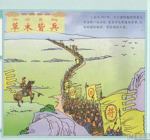 《晋书·苻坚载记》:“坚与苻融登城而望王师,见部阵齐整,将士精锐;又北望八公山上草森皆类人形,顾谓融曰:‘此亦劲敌也,何谓少乎?’怃然有惧色。”