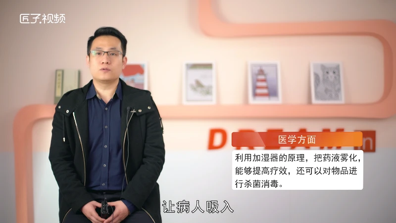 理论研究表明,在振幅相同的条件下,一个物体振动的能量与振动频率成正比,超声波在介质中传播时,介质质点振动的频率很高,因而能量很大,在中国北方干燥的冬季,如果把超声波通入水罐中,剧烈的振动会使罐中的水破碎成许多小雾滴,再用小风扇把雾滴吹入室内,就可以增加室内空气湿度,这就是超声波加湿器的原理。如咽喉炎、气管炎等疾病,很难利用血流使药物到达患病的部位,利用加湿器的原理,把药液雾化,让病人吸入,能够提高疗效。