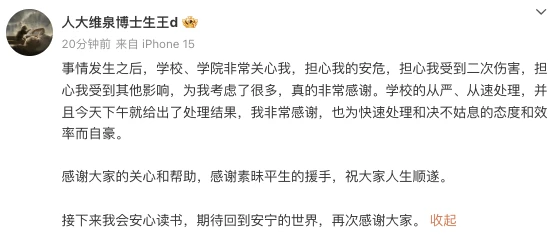 7月21日,中国人民大学一博士生举报其导师对其性骚扰。22日人大公布相关事件处理结果,对此,当事人发文称,“事情发生之后,学校、学院非常关心我,担心我的安危,担心我受到二次伤害,担心我受到其他影响,为我考虑了很多,真的非常感谢。学校的从严、从速处理,并且今天下午就给出了处理结果,我非常感谢,也为快速处理和决不姑息的态度和效率而自豪。”其表示 ,“接下来我会安心读书,期待回到安宁的世界,再次感谢大家。”
