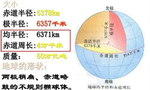 经过测量,地球的极半径为6357千米,赤道半径为6378千米,地球的平均半径为6371千米,地球表面积为5.1亿平方千米,赤道周长约4万千米。因地球是一个两极稍扁、赤道略鼓的不规则球体,故赤道为地球的最大周长,约是4万千米。