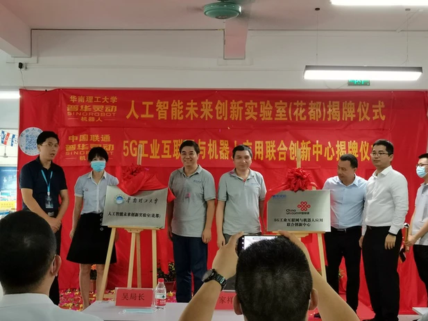 比赛开幕式上,还举办了“人工智能未来创新实验室(花都)”(以下简称未来创新实验室)、“5G工业互联网与机器人联合创新中心”(以下简称5G创新中心)的揭牌仪式。此次揭牌,是华南理工大学、普华灵动及中国联通三方在战略上达成合作的有效实践,是响应国家推出的“5G”“人工智能教育”“新工业”等新基建的有益探索,是实现三者深度融合的积极探讨。
