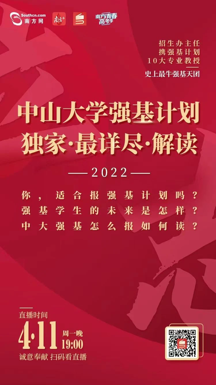 2022年4月11日(周一)晚上19:00,由南方新闻网主办的“南方青春高考季-高考招生咨询会”活动,邀请中山大学招生办公室主任荐志强携十大学科教授做客南方报业传媒集团演播室,为全国考生详解强基计划!