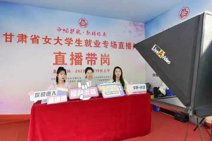 主播在甘肃省女大学生就业专场招聘活动现场进行“直播带岗”。新华社记者 范培珅 摄