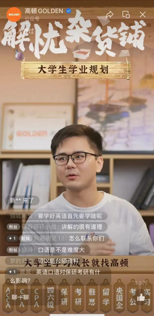 深耕教育领域多年,高顿深知新生在刚进入大学时,对大学生活产生的不适应与迷茫,为帮助学子扫除学习成长路上的种种困惑,高顿推出"解忧杂货铺"系列公益直播,在线为同学们答疑解惑,栏目一经推出,获得了广大新生的强烈关注。
