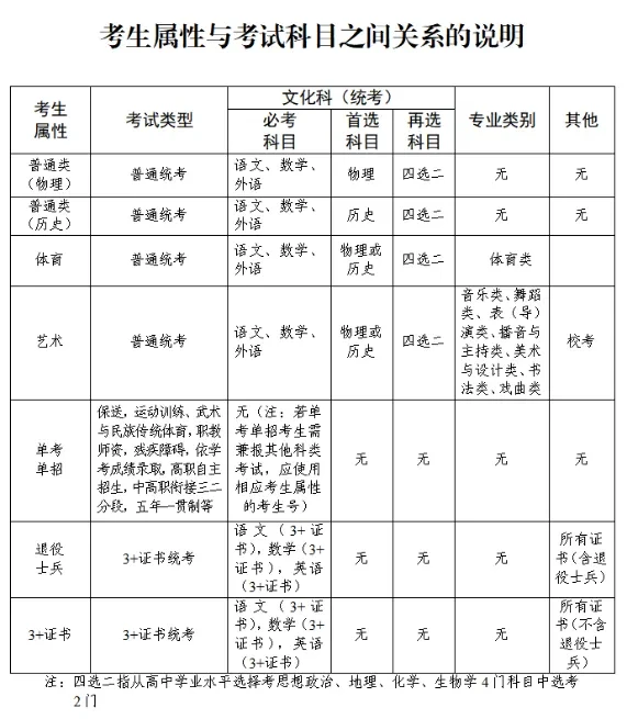 ·艺术类考生(音乐类、舞蹈类、表(导)演类、播音与主持类、美术与设计类、书法类、戏曲类)考试科目为:在普通类(物理)或普通类(历史)考试科目的基础上加考艺术术科。