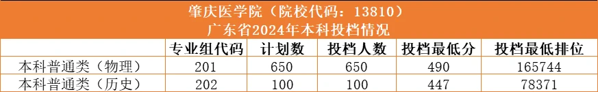 肇庆医学院2024年在本科普通批(物理)招650人,投档最低分490,投档最低排位165744;本科普通批(历史)招100人,投档最低分447,投档最低排位78371。