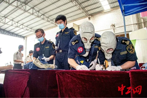 技能实操环节分为进境粮食查验和进境木材熏蒸气体检测两个项目,选手们分组竞技,在规定时间内使用工具完成检疫实操全流程,“真刀真枪”上阵检验“真功夫”。在裁判员的顺序叫号声中,选手排队依次领取熏蒸气体检测仪、防毒面具等实操工具。