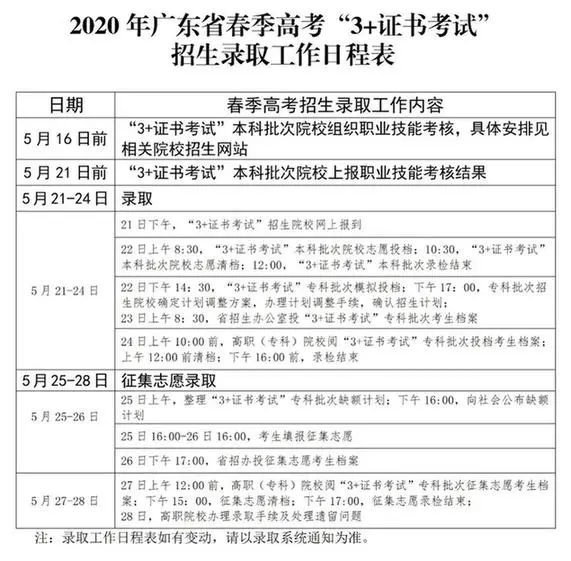 南方网讯(记者/柯丹洁 通讯员/粤考宣)5月11日,广东省教育考试院发布《关于做好广东省2020年普通高校招收中等职业学校毕业生统一考试招生录取工作的通知》。通知指出,广东省2020年“3+证书考试”录取时间为5月21-28日。省考试院提醒,参加春季高考“3+证书考试”招生被本科层次院校录取的考生不得再参加春季高考“高职自主招生”录取及夏季高考招生录取;被高职(专科)院校录取的考生,不能参加2020年春季高考“高职自主招生”录取以及夏季高考高职(专科)院校的招生录取。