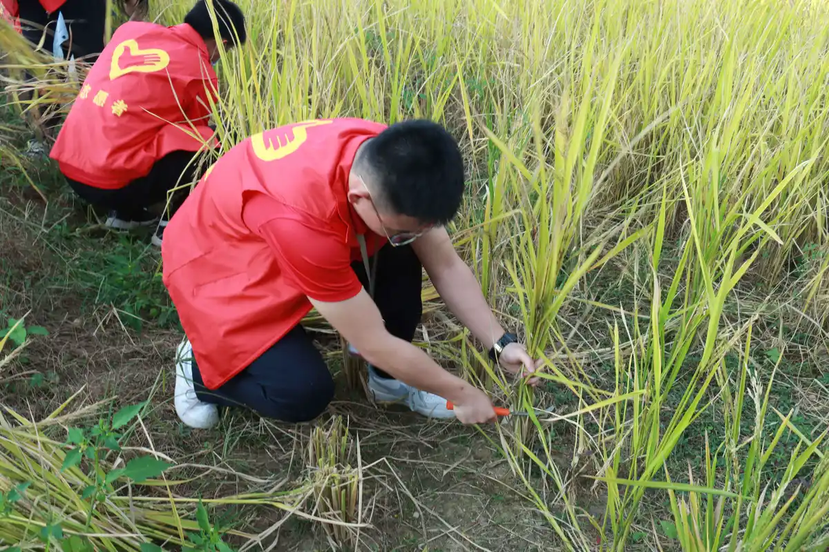 学史力行,助农收割暖人心。在管理与法务学院党总支书记、执行院长朱友发的带领下,同学们拿起工具,走进丰茂的稻田。大家分工协作,有的负责割稻谷,有的负责脱稻穗,有的负责将脱过穗的稻草扎成捆整齐堆放。在村民的指导下,同学们学习各类农具的使用方法。一开始,锋利的镰刀用得很不顺手,经过不懈努力,在“磕绊”中,大家逐渐掌握了技巧,渐渐能够挥舞镰刀进行有节奏的收割、捆扎、清扫。只见他们在田间或埋头割水稻,或伸腰抱稻禾,或脚踏脱谷机……田地里一片繁忙的丰收景象。