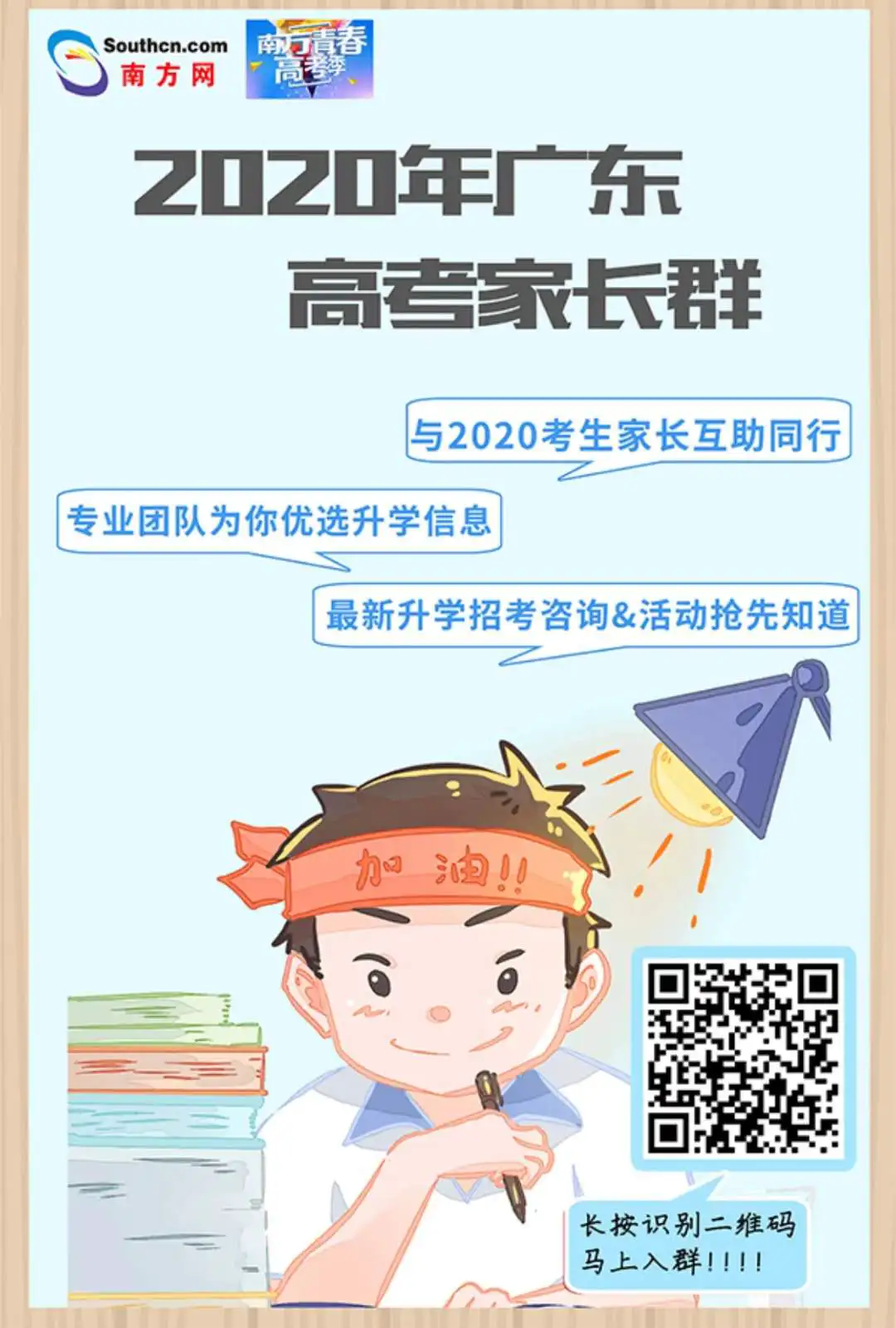 考生及家长可以扫描海报右下方的二维码,进入广东高考家长群,及时了解相关资讯。