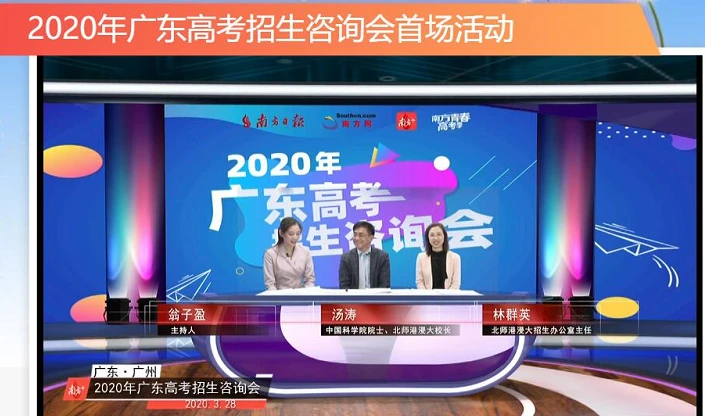 3月28日下午,“南方青春高考季-2020年广东高考招生咨询会”首场活动线上启动。活动邀请到是中国科学院院士、北京师范大学—香港浸会大学联合国际学院(下称“北师港浸大”)校长汤涛、北师港浸大招生办公室主任林群英做客南方报业传媒集团融媒体演播室,畅谈北师港浸大的办学特色、招生情况,指导考生科学备考及规划未来的大学生活。