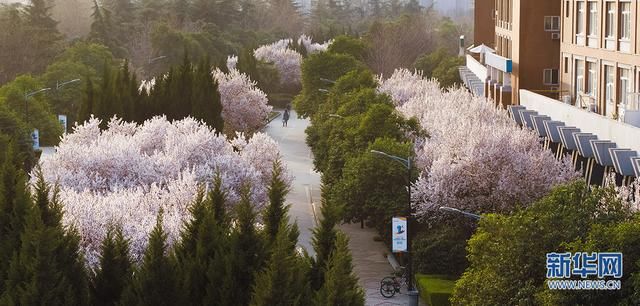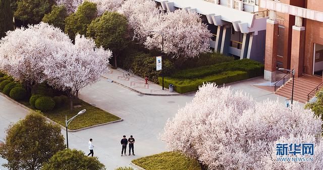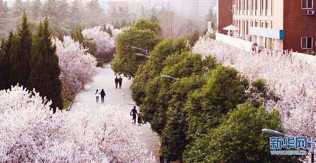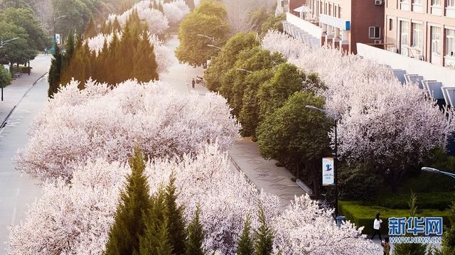 教学楼两旁的花树,从最初的含苞待放,到如今的繁花盛开。微风吹过,些许花瓣纷纷扬扬,宛如仙境。新华网发 刘夙培摄