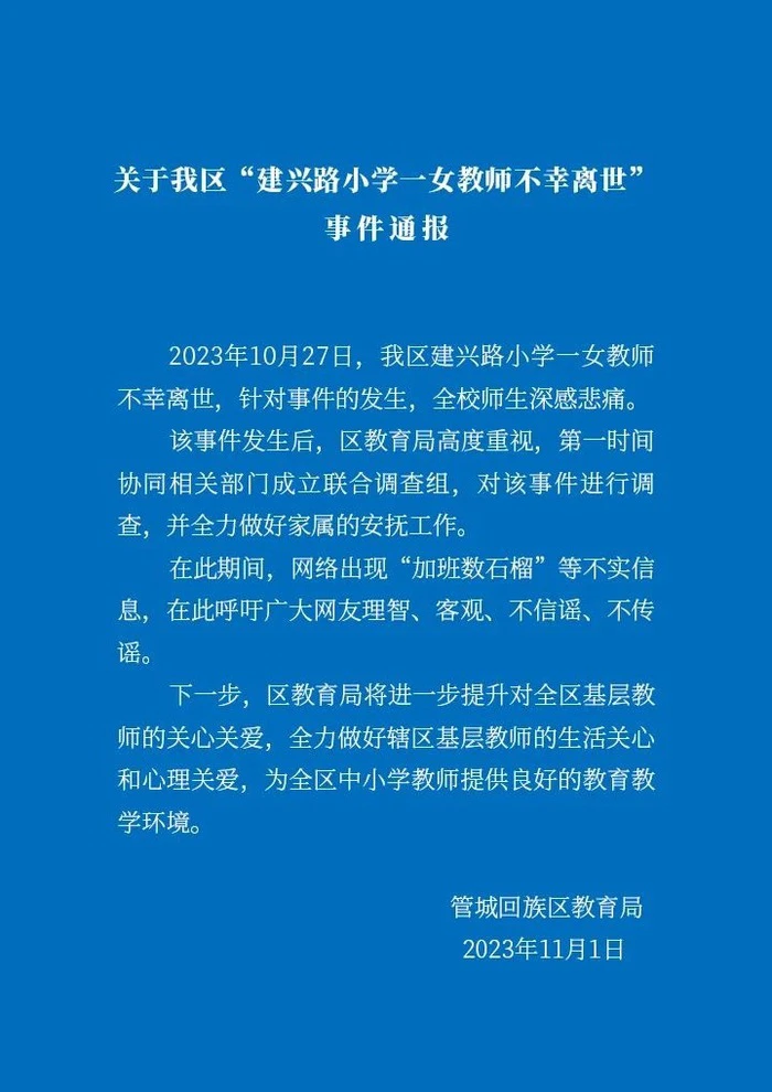 “管城发布”微信公众号消息,11月1日,管城回族区教育局就“建兴路小学一女教师不幸离世”事件发布通报: