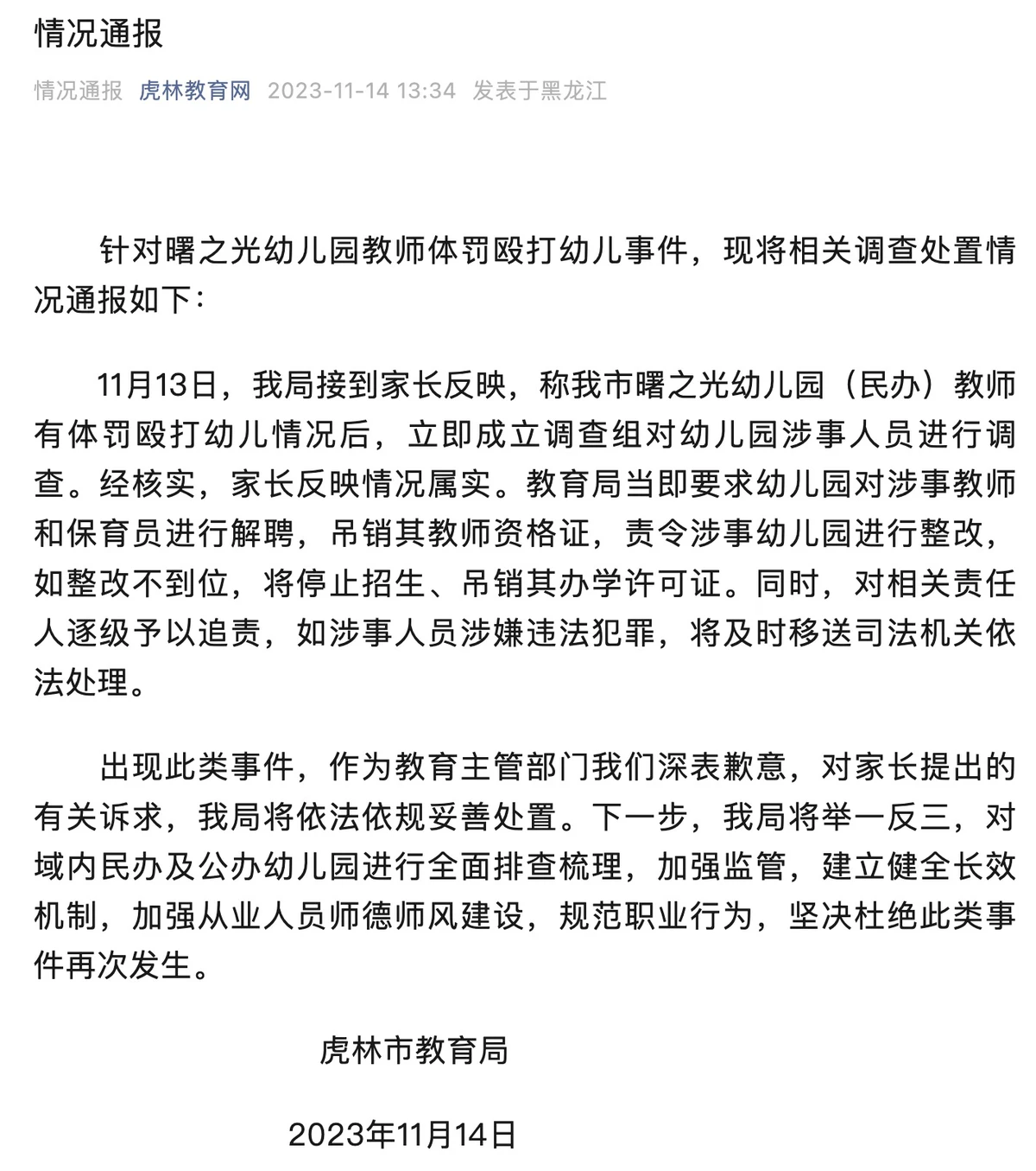 虎林市教育局11月14日发布情况通报,针对曙之光幼儿园教师体罚殴打幼儿事件,现将相关调查处置情况通报如下: