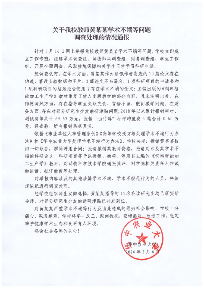 2月6日,华中农业大学在其官方微博通报教师黄某某学术不端等问题调查处理情况。经调查认定,在学术方面,黄某某作为通讯作者发表的10篇论文存在伪造、篡改实验数据和图片,2篇论文不当署名;1项科研项目的申请书和1项科研项目的结题报告使用了存在学术不端的论文;主编出版的《饲料智能加工生产学》教材重复了他人出版教材的部分内容,且未注明出处。在师德师风方面,存在指导学生失职失责、言语不当、敷衍教学问题。在财务方面,存在对部分研究生少发助研津贴问题;2018年以来累计报销耗材、测试费等共计69.63万元,报销“山竹醇”标样购置费5笔合计0.60万元;经查验,所有报销票据真实。