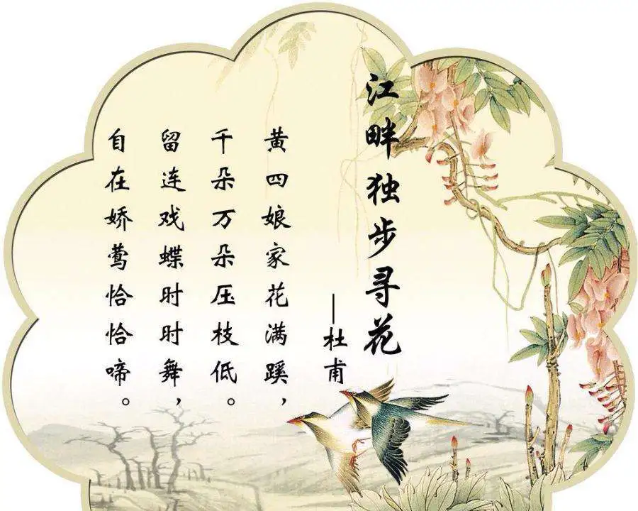 《江畔独步寻花·其六》【杜甫】黄四娘家花满蹊,千朵万朵压枝低。留连戏蝶时时舞,自在娇莺恰恰啼。白话译文:黄四娘家花儿茂盛把小路遮蔽,万千花朵压弯枝条离地低又低。嬉闹的彩蝶在花间盘旋飞舞不舍离去,自由自在的小黄莺叫声悦耳动人。后两句使用了对偶和拟人的修辞手法,将春意闹的情趣渲染出来,表达了诗人对鲜花和大自然的热爱以及赞美,也表现了作者醉心于美景,心怀喜悦的内心情感。