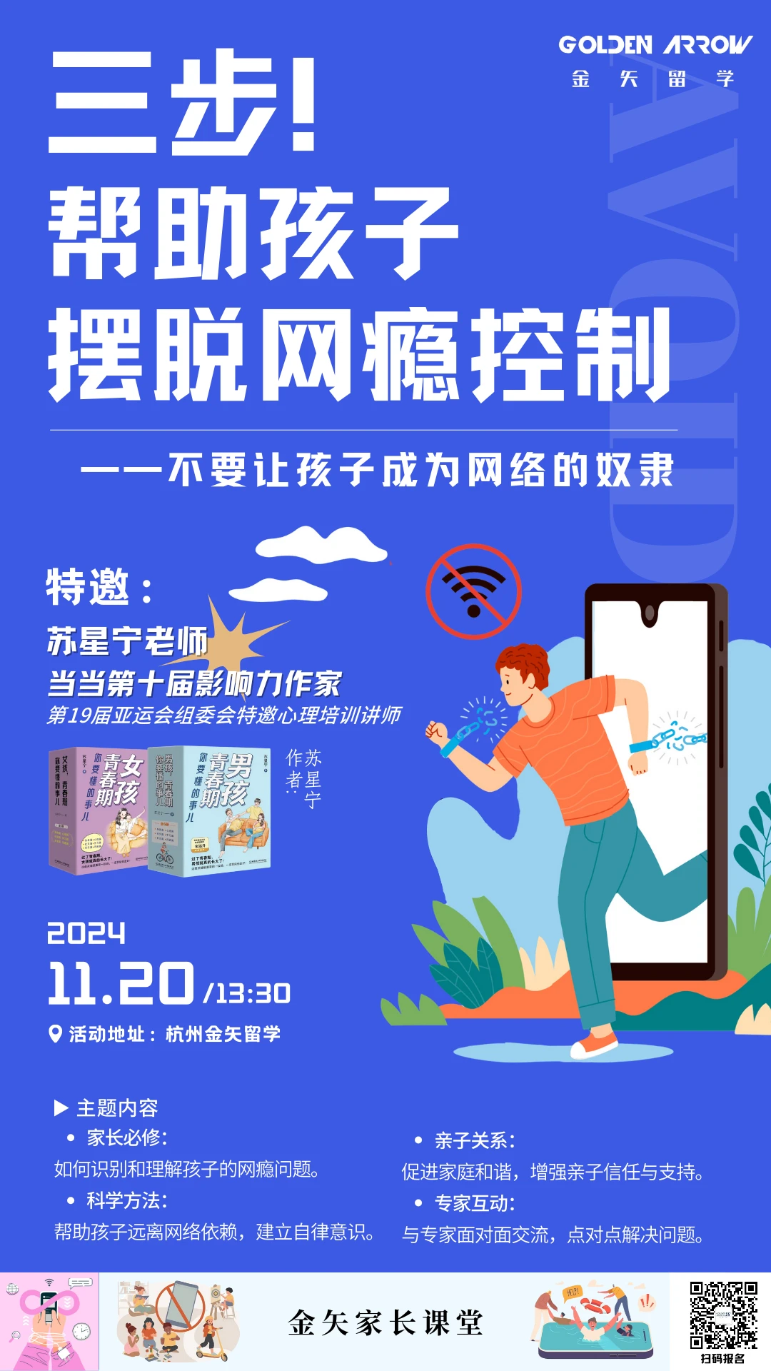 本月【金矢家长课堂】特邀明星作家苏星宁老师,将围绕网瘾的三大应对策略展开,旨在帮助家长深入了解网瘾问题的本质和应对方法,提升亲子沟通和引导能力,从而共同走向健康未来。