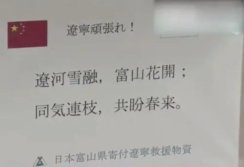 ”辽河雪融,富山花开;同气连枝,共盼春来“其大概意思是:辽河的雪融化来了,富士山的花也开了,我们兄弟姐妹,等待寒冬过去,春季到来。这首诗不是原句,而是一首改编的诗,是日本友人在2020年新冠肺炎肆虐时捐赠我国医疗物资时上面写的。