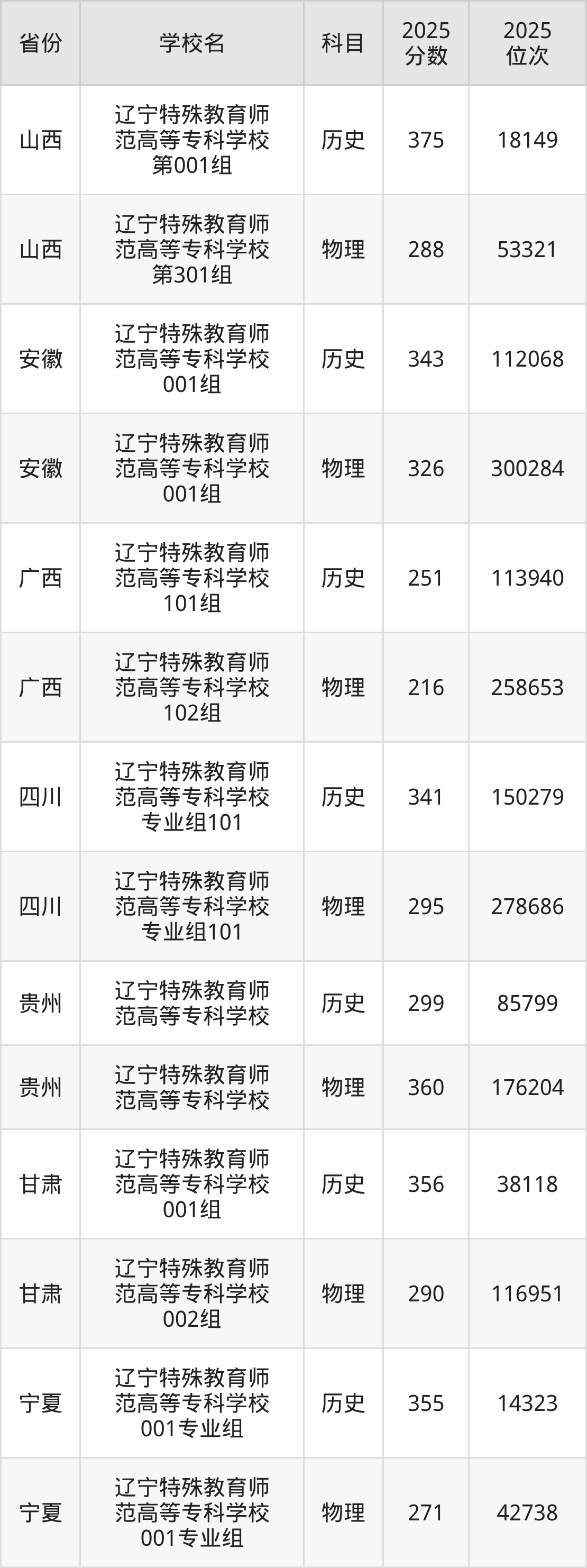 2025年辽宁特殊教育师范高等专科学校在省外录取分数线范围整体位于216分到375分之间,录取分数线最低在广西物理(102组)、录取分数线最高在山西历史(第001组)。