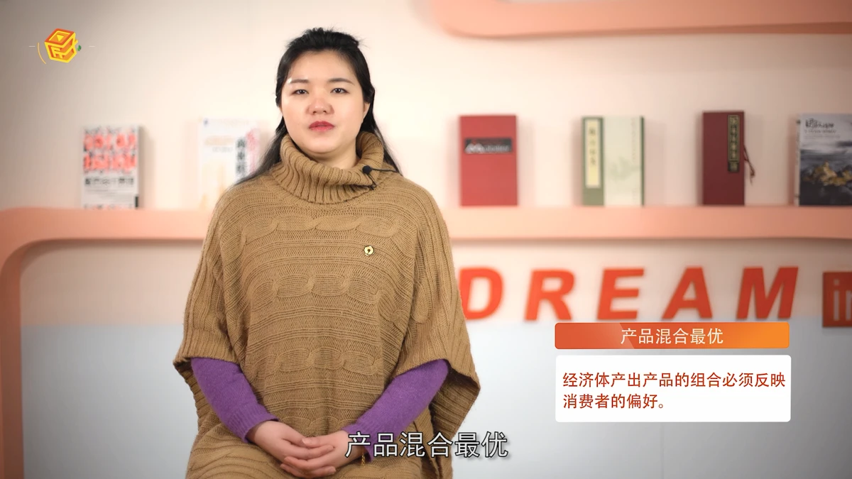 产品混合最优:经济体产出产品的组合必须反映消费者的偏好。此时任意两种商品之间的边际替代率必须与任何生产者在这两种商品之间的边际产品转换率相同。