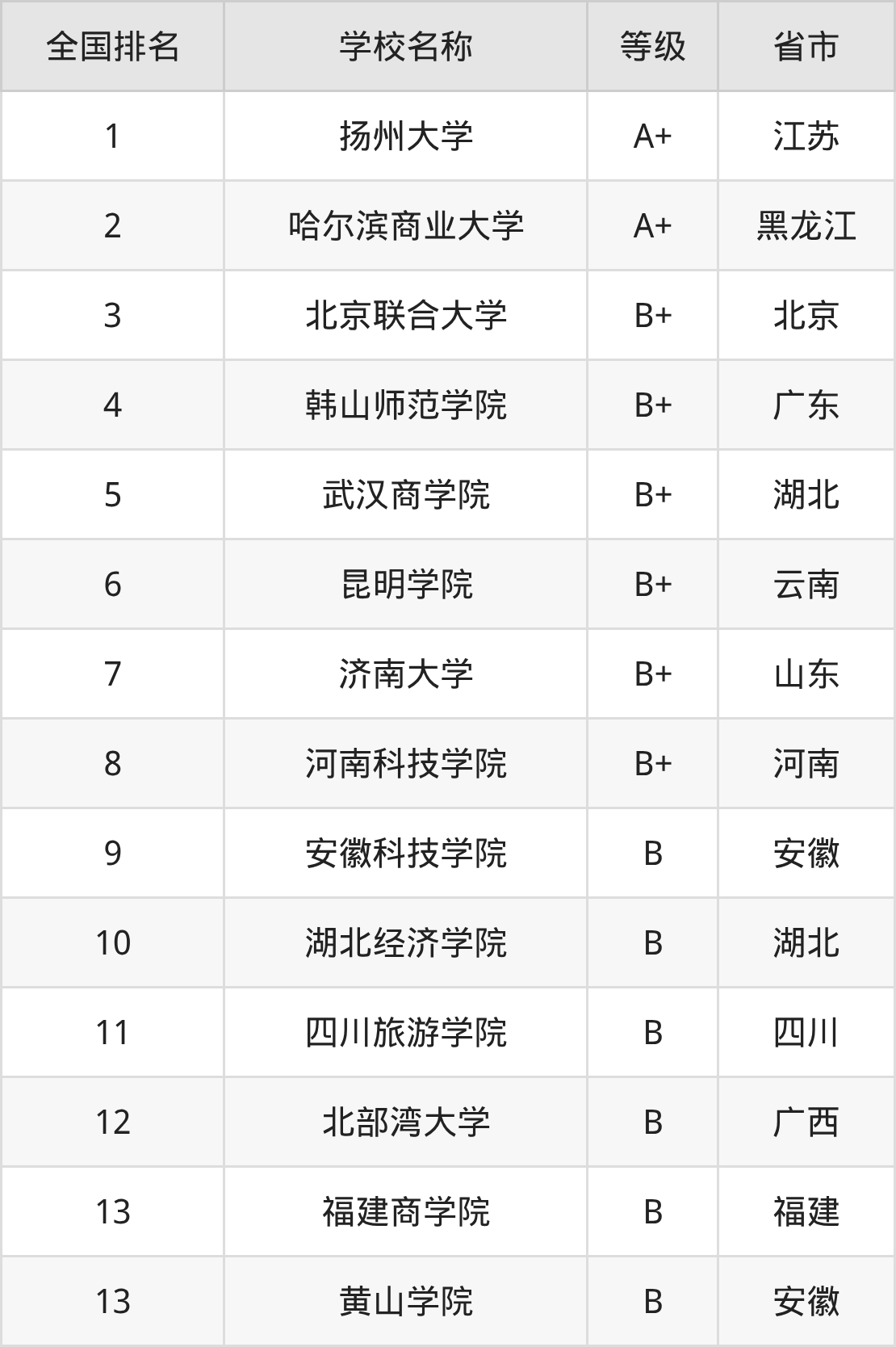 全国烹饪与营养教育开设院校参与排名的共有14所,实力最强的是扬州大学(全国排名第1名),其专业实力等级被评为A+级。