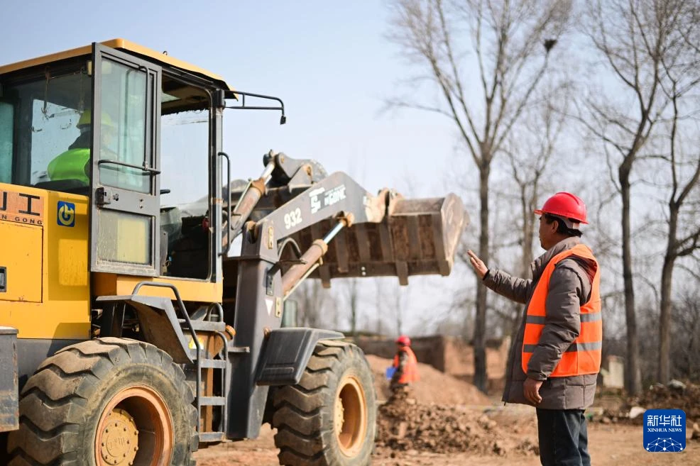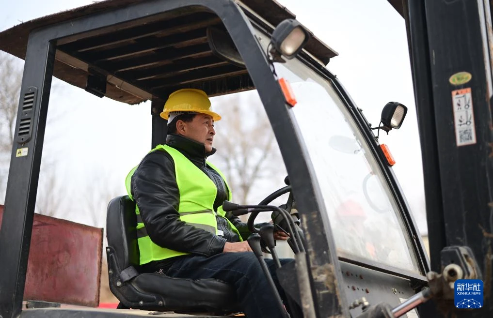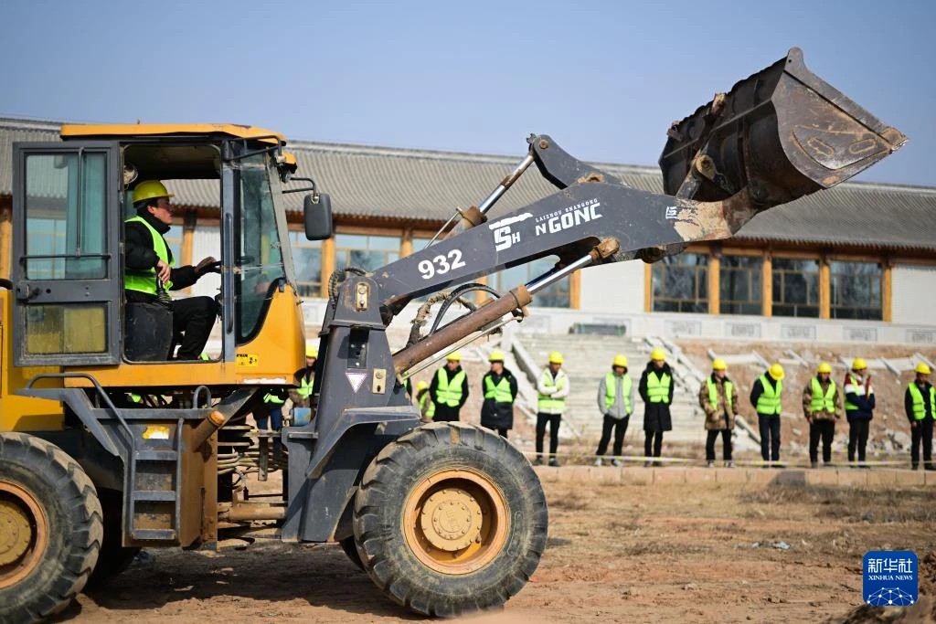 2月1日,在青海省海东市民和回族土族自治县官亭镇喇家村,技能培训师董成在教授当地村民驾驶装载机。