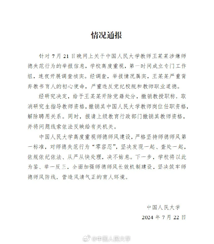 7月22日,中国人民大学发布情况通报:针对7月21日晚网上关于中国人民大学教师王某某涉嫌师德失范行为的举报信息,学校高度重视,第一时间成立专门工作组,连夜开展调查核实。经调查,举报情况属实,王某某严重背弃教书育人的初心使命,严重违反党纪校规和教师职业道德。