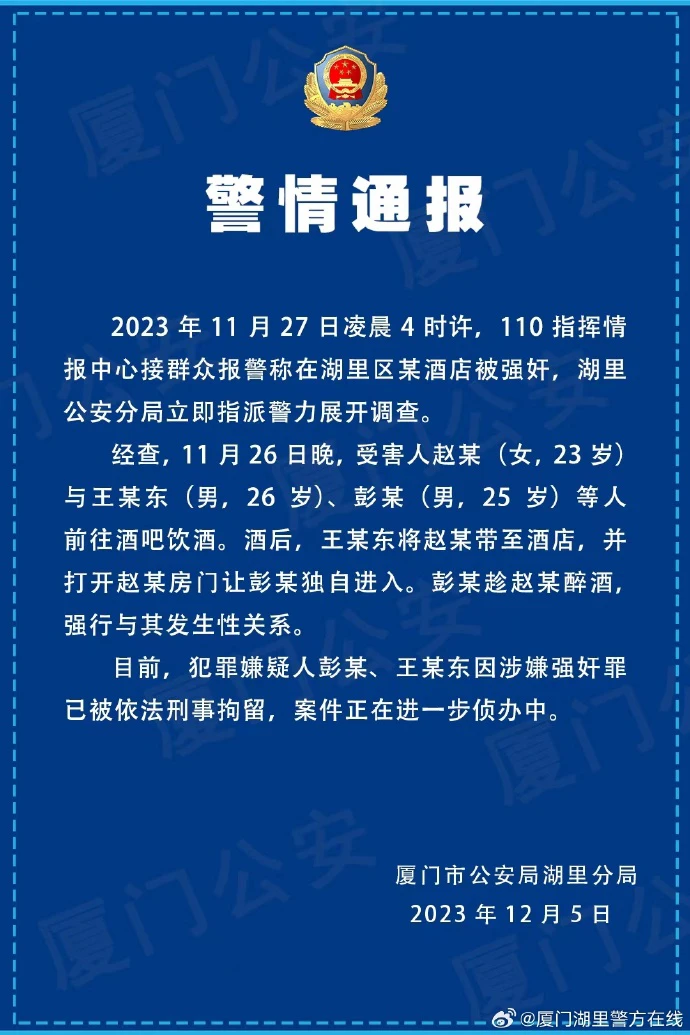 12月4日晚,“厦门知名中学的多名教师在酒后侵犯女实习生”的网帖引发关注。12月5日,厦门市公安局湖里分局发布警情通报称,经查,11月26日晚,受害人赵某(女,23岁)与王某东(男,26岁)、彭某(男,25岁)等人前往酒吧饮酒。酒后,王某东将赵某带至酒店,并打开赵某房门让彭某独自进入。彭某趁赵某醉酒,强行与其发生性关系。目前,犯罪嫌疑人彭某、王某东因涉嫌强奸罪已被依法刑事拘留,案件正在进一步侦办中。
