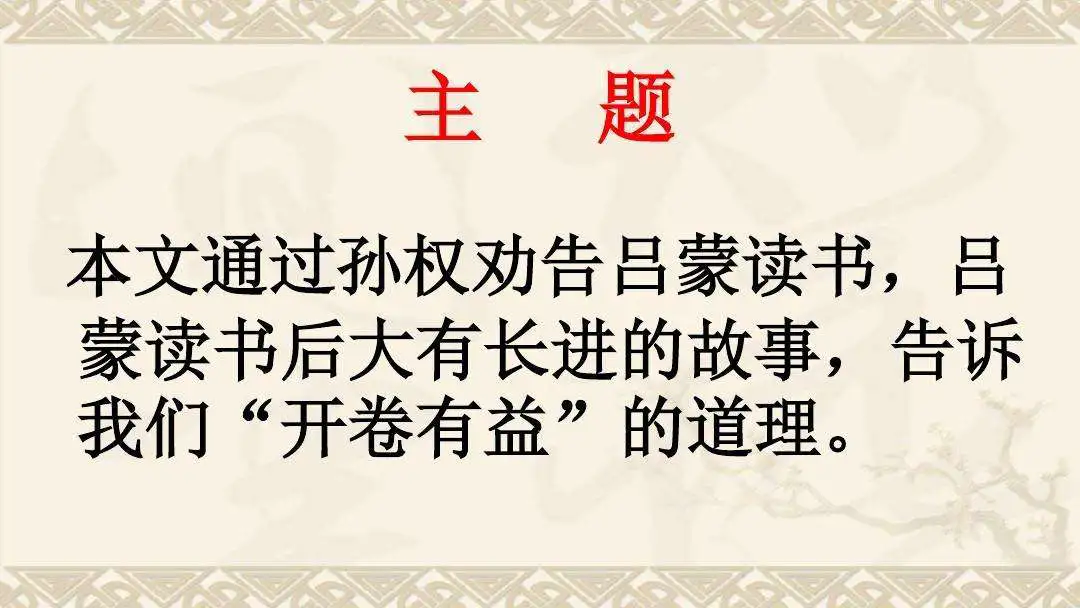 起初,吴王孙权对大将吕蒙说道:“你现在身当要职掌握重权,不可不进一步去学习!”吕蒙以军营中事务繁多为理由加以推辞.孙权说:“我难道是想要你钻研经史典籍而成为学问渊博的学者吗?只是应当广泛地学习知识而不必去深钻精通.你说要处理许多事务,哪一个比得上我处理的事务呢?我常常读书,自己感到获得了很大的收益.”吕蒙于是开始学习.等到东吴名将鲁肃路过寻阳,与吕蒙研讨论说天下大事,鲁肃听到吕蒙的见解后非常惊奇地说:“你如今的才干谋略,已不再是过去的东吴吕蒙可相比的了!”吕蒙说:“对于有志气的人,分别了数日后,就应当擦亮眼睛重新看待他的才能,老兄你为什么看到事物的变化这么晚呢!”鲁肃于是拜见吕蒙的母亲,与吕蒙结为好友,然后告别而去.