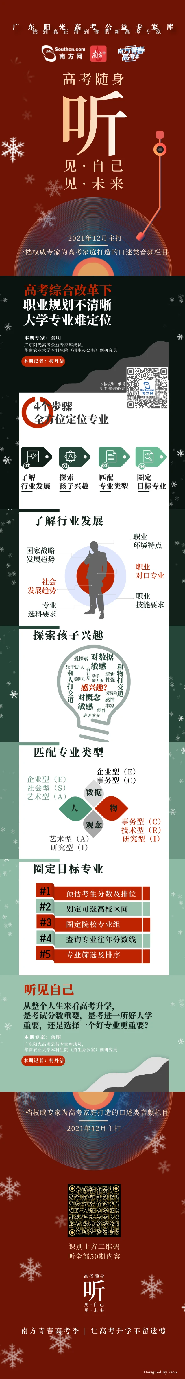 本期《听》邀请广东阳光高考公益专家库专家,华南农业大学本科生院(招生办公室)副研究员余明,从“了解行业发展、探索孩子兴趣、匹配专业类型、圈定目标专业”四个方面,深度解析如何全方位辅助孩子定位专业。一起来看看