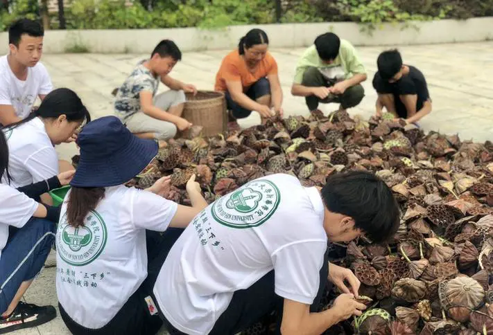 实践队队员在剥莲蓬(摄影:林泳怡、郭思宇)