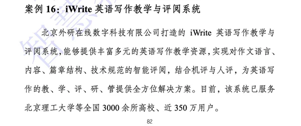 其中,《智慧校园发展及产业图谱研究报告》已经是第三年连续发布。报告梳理了国内外智慧校园建设情况,研究了政策、技术、应用等关键要素发展趋势,总结了产业发展总体情况并绘制产业图谱,遴选了应用实践案例,并对促进智慧校园建设及发展提出了建议。入选此报告的iWrite是外研在线研发的首款人工智能深度赋能产品,其实现基于二语写作理论的四维综合评价,能够实现语言、内容、篇章结构及技术规范四个维度的机器智能评阅,构建基于神经机器翻译(Neural Machine Translation)的端到端纠错模型、基于先进预训练模型BERT的纠错模型、基于语法规则的简约模型,三大模型联动,极大提升引擎纠错性能,评分准确率达98%、召回率84%、人机一致性0.9,将机评和人评深度结合,以机评促反馈,全面助力写作教学效率提升。