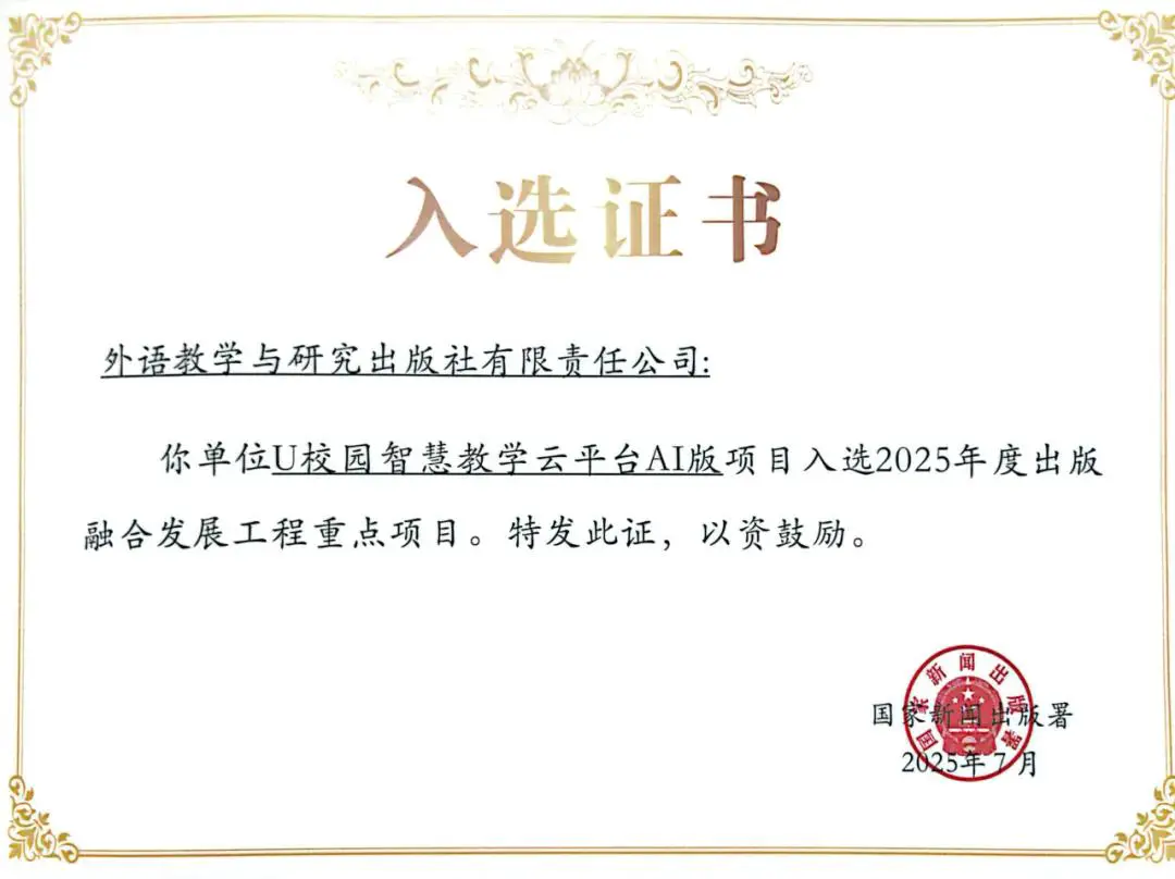 2025年9月5日,2025年度出版融合发展工程重点项目集中推介会在北京召开,会上公布了国家新闻出版署2025年度出版融合发展工程重点项目名单,外语教学与研究出版社“U校园智慧教学云平台AI版”成功入选。外研社副总编辑彭冬林出席会议并代表外研社领奖。