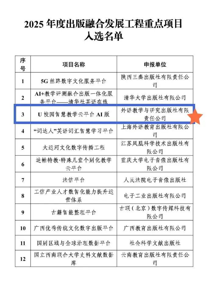 为贯彻落实党的二十届三中全会关于文化和科技融合的重要部署,顺应新一轮科技革命和产业变革迅猛发展趋势,着眼壮大数字时代出版主流阵地,推动出版深度融合发展取得更明显成效,国家新闻出版署2025年组织实施出版融合发展工程。经遴选推荐,包括外语教学与研究出版社“U校园智慧教学云平台AI版”在内的40个项目在价值导向、内容质量、技术应用、模式创新、发展成效等方面较为突出,是出版单位和文化科技企业抢抓数字化、智能化机遇,推动实现出版深度融合发展的代表性成果。
