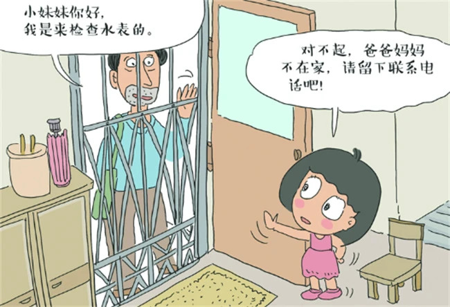 还有一些坏人会伪装成查水表或者是修理工说家里的管道坏了,或者是哪里出现了问题来检修的,告诉孩子,这种人一定不要给开门,并且及时给爸爸打电话,假如真是来维修或者是查水表的,让他们有事情和爸爸联系。爸爸确认没问题了之后会给你打电话。这个前提是必须家里面有电话,孩子可以接到电话,如果外面的陌生人让孩子接电话说是爸爸打来的那种一定是骗子。
