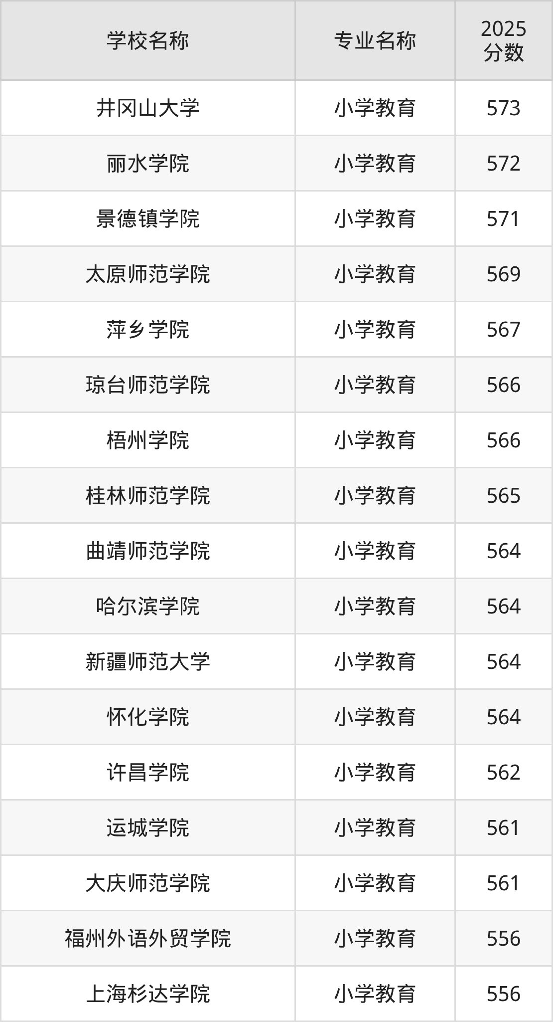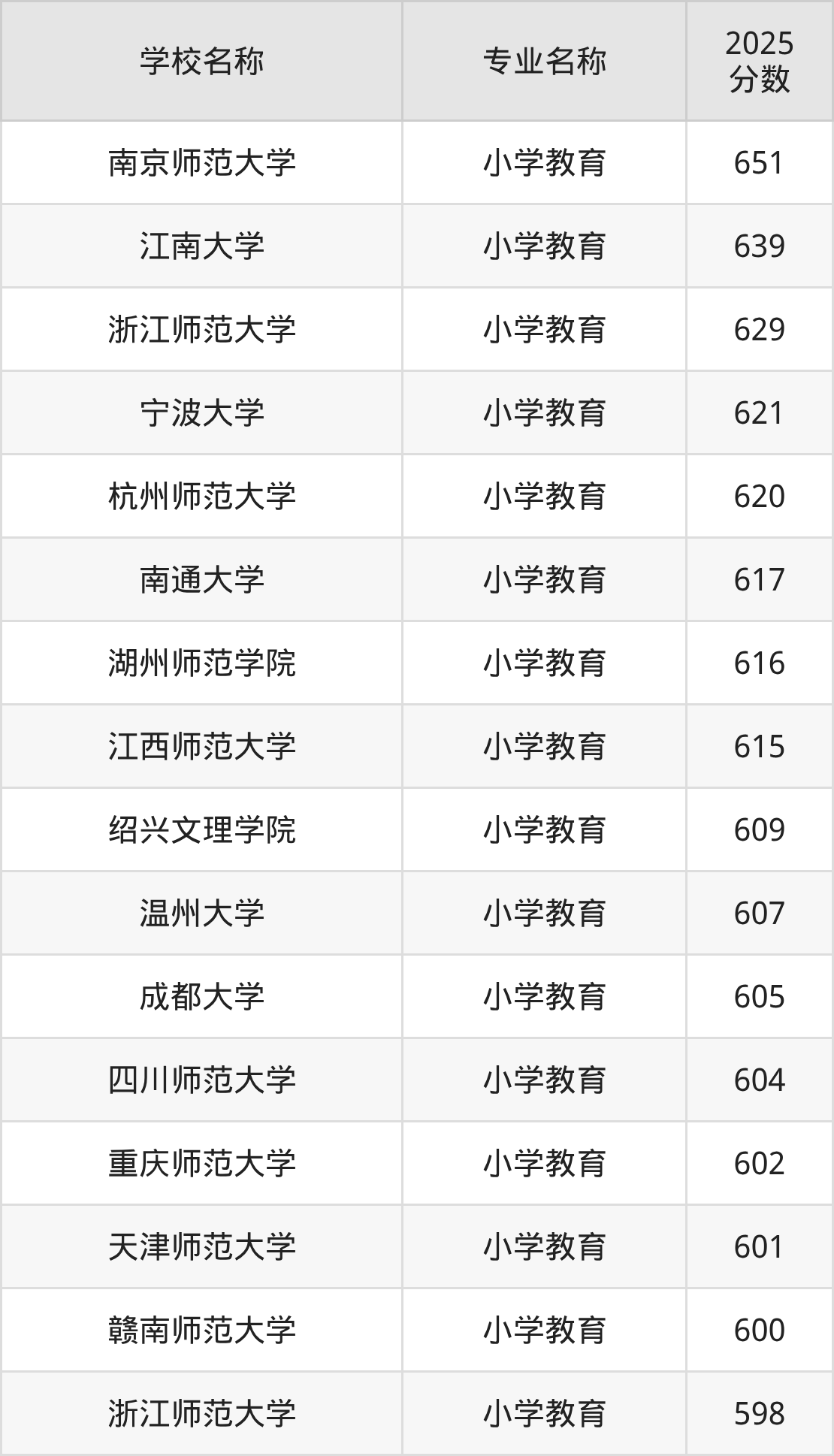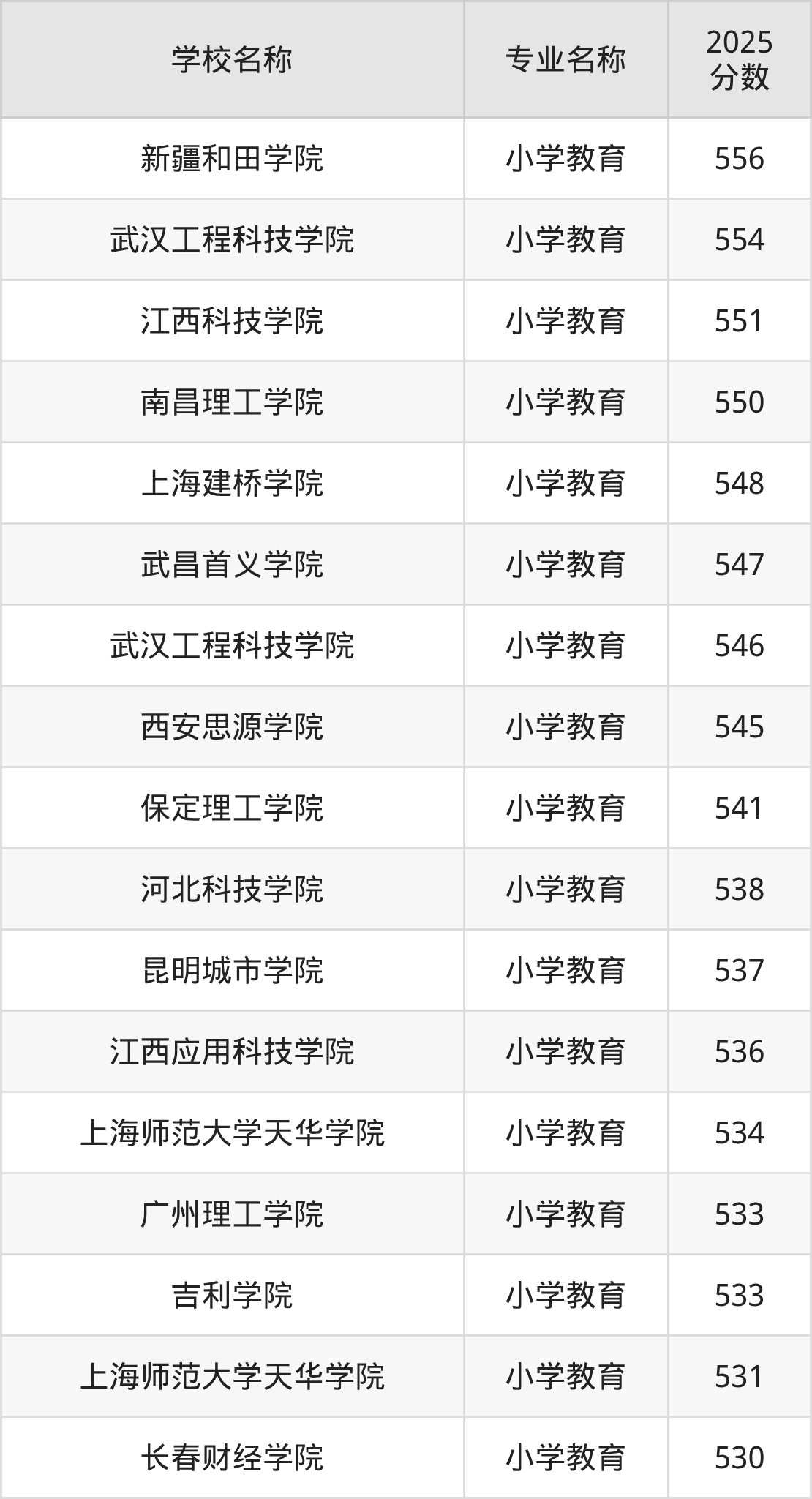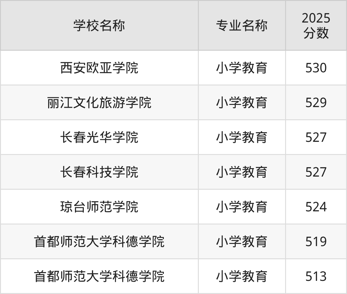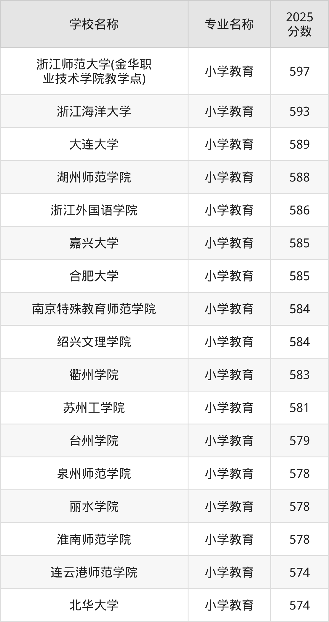 下面是2025年全国本科小学教育专业大学录取分数线。
