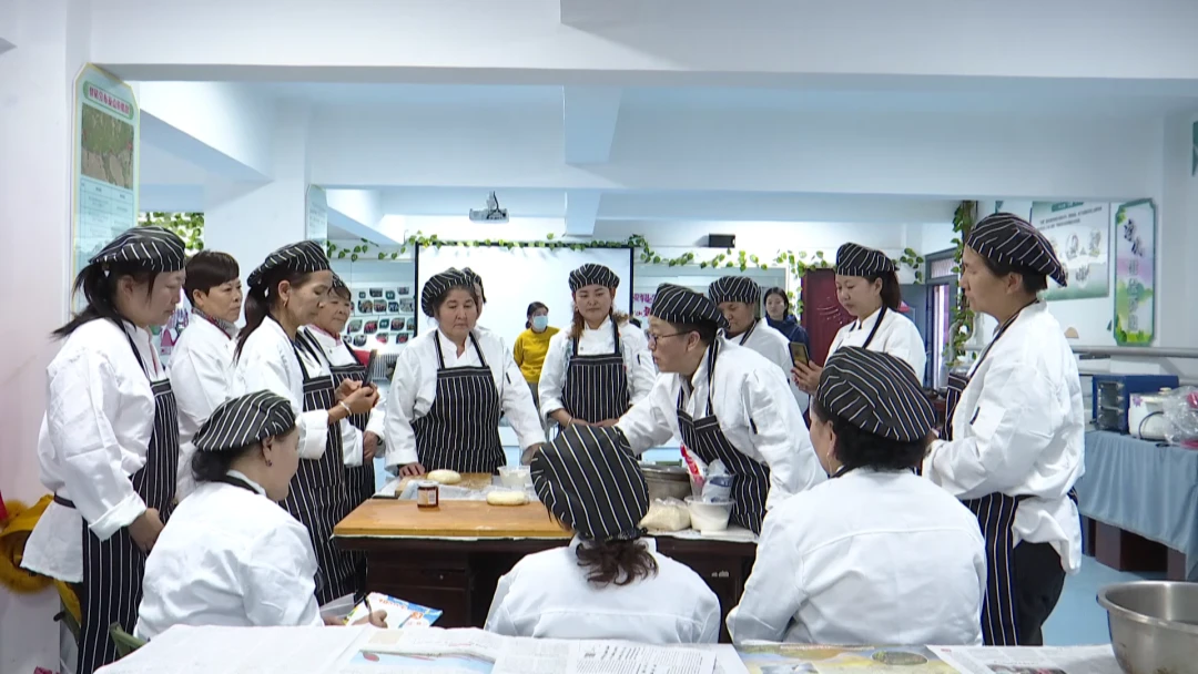 在精河镇幸福社区活动室,精河县技工学校授课老师正手把手地给学员们教授如何做出各式花样的面点,学员们大胆动手实践操作,培训现场气氛热烈。