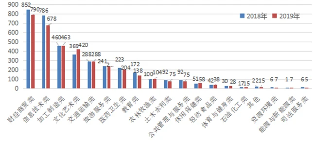 2018、2019年中等职业学校各专业大类布点数变化情况